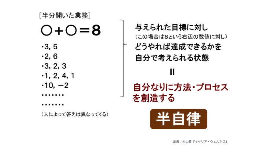 これは「半分開いた業務」というべきものです。この種の仕事ではそれを行う人のやり方や創意工夫によって個性が出ます。これができる状態を「半自律」とみます。