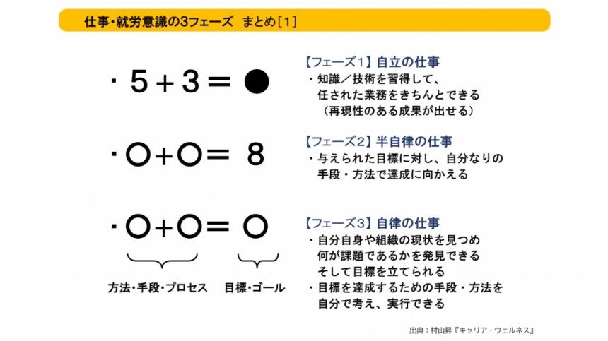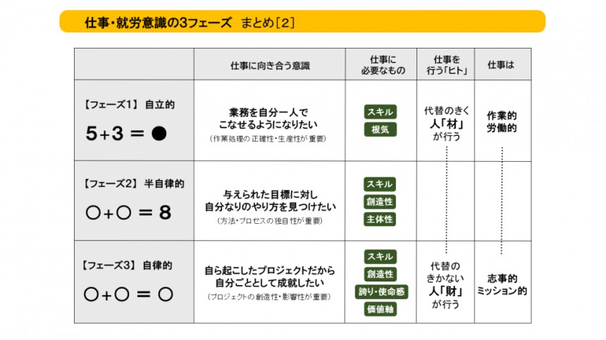 自立から自律に向かう仕事・就労意識の3フェーズを1枚のスライドにまとめるとこうなります。