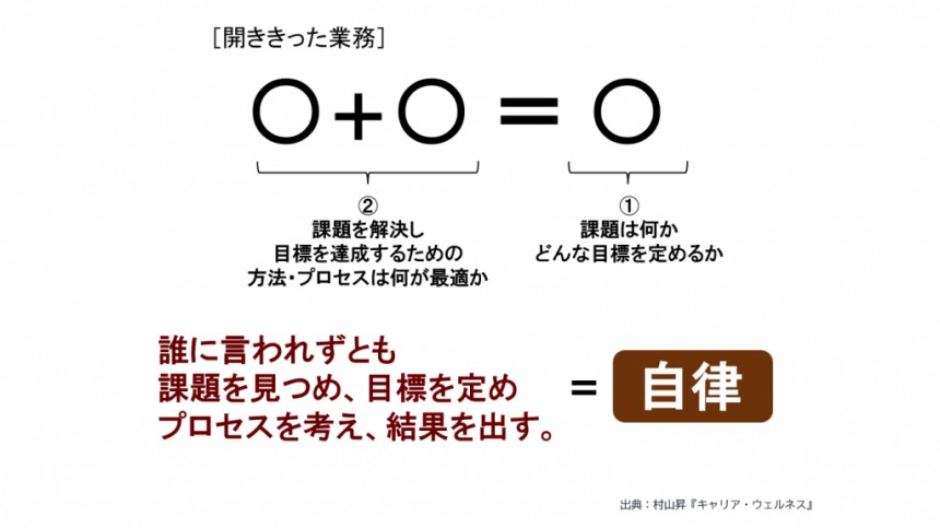 また、「○+○=○」の形は、「○+○×○÷○-○=○」のようにどんどん発展させていくことができます。すなわち、足し算という技能だけでなく、掛け算とか割り算とかいろいろな技能を追加習得して、複合的に組み合わせ、自分が定めた右辺の目標達成に向かっていく。そうした右辺(=目標・ゴール)と、左辺(方法・手段・プロセス)の組み合わせを自在につくり出していくことが「自律」的に仕事をやる面白さです。