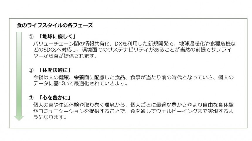 「より良い姿」とは、今まで解決できなかった社会課題へのアプローチを行ったり、個人のより豊かな楽しみを実現したりできる「心」「体」「地球」のバランスがとれた姿のことです。例えば、テクノロジーによって需要予測の精度が高まるとします。すると、在庫ロスや機会ロスが削減されてフードロスの発生量が低下したり、個別ニーズに合わせた少量多品種のロングテールな製品・サービスへ細やかに対応したりすることが可能となっていきます。DXによって変革された未来の食のライフスタイルとして、先述の3つのバランスを踏まえて以下のような進展が今後予想されます。