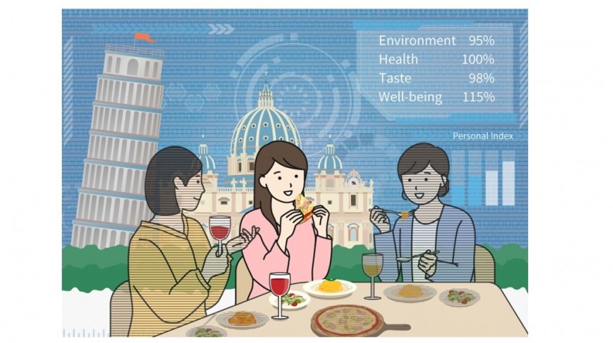 先述の様に、未来では「地球に優しく」、「体を快適に」、「心を豊かに」の3つのバランスを実現する食のパーソナライズ化が進むと考えられます。私たち消費者が体験できるであろう未来の1つの食シーンを紹介します。