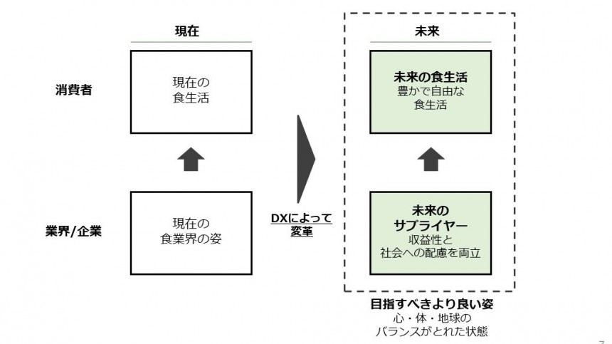 本稿では食のDXを「食の業界に関わるプレイヤーが、業界の枠組みを超え、地球と人々の健康を守りつつ、デジタル技術を活用して多様な価値観に応えることで、“豊かで自由な食生活”を叶え、人々の幸福を実現すること」と定義します。私たちは、現在の「消費者の食生活」、それを実現する「現在の食業界」のそれぞれがDXに変革され、より良い姿になっていくと考えているのです。