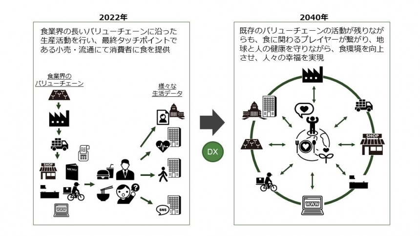 このために、大量生産大量消費型のマス・カスタマイゼーションが残りながらも、食業界のバリューチェーンのあり方といった業界構造、組織や業務プロセス、ビジネスモデルのような既存の仕組み、業界・企業の側にも、変革が求められることが考えられます。さらに、消費者の協力も必要不可欠であり、参加型で食の体験の恩恵が受けられることで、消費者とともに好循環かつ効率的なデータとモノの流れを構築し、消費者とサプライヤーサイドの行動をともに引き出す必要があります。