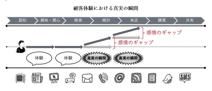 カスタマージャーニーとは、顧客が自社の商品・サービスを購買するまでに至る行動全般のことを指します。情報収集をするとき、店頭で陳列されている商品を目にして購買の意思決定を下すとき、購買後に実際に商品を使用するときなど、商品と顧客のタッチポイントにおける行動と感情を洗い出し、どこで顧客の期待値を超える経験(「真実の瞬間」)がつくり出せるかを設計することが大切です。