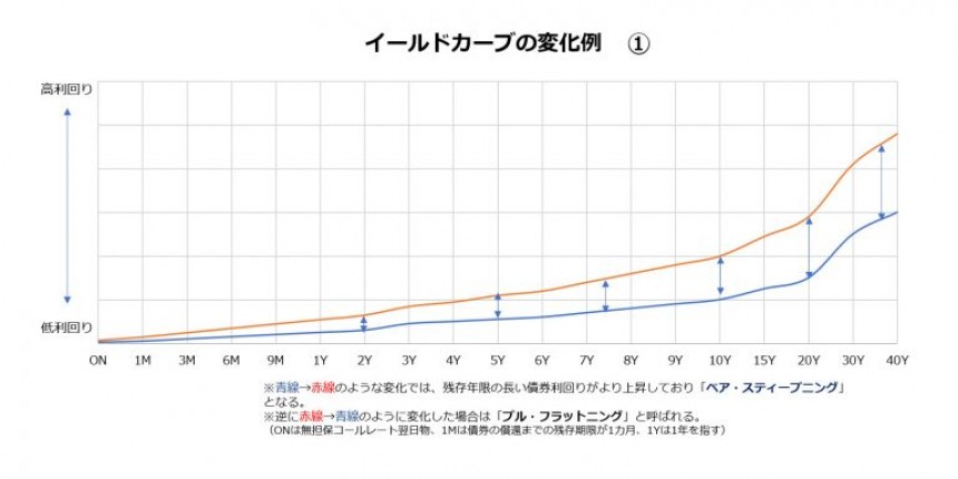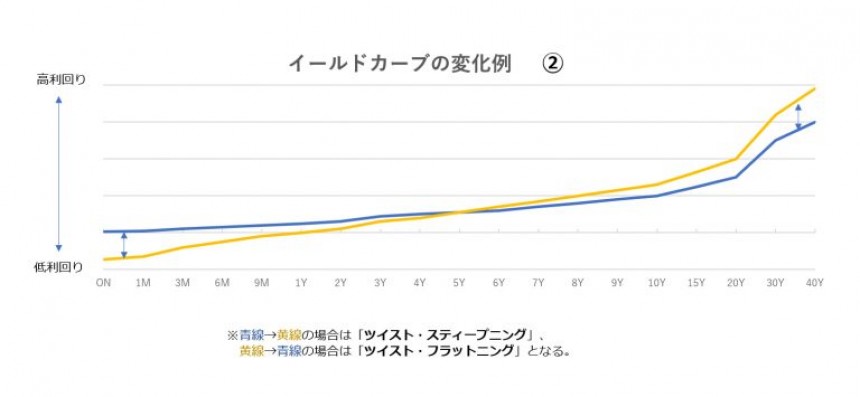 反対に金利に全体的な低下圧力が掛かり、短期金利よりも長期金利がより大きく低下することを「ブル・フラットニング」と呼びます(下の図「変化例①」において赤線→青線に変化するケースが該当します)。