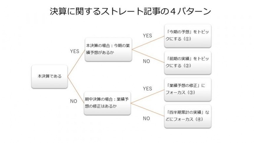 決算記事といっても様々なスタイルがあります。新聞社や通信社によって、配信方法も異なりますが、主なものとしては、企業側の発表内容をコンパクトにまとめたストレート記事(いわゆる「発表モノ」、知見録関連記事:経済ニュース「1文目」は多くを語る)、ある業界の主要企業の決算の傾向をまとめた「決算まとめ」記事のほか、公表前の決算に関する情報を独自ネタとして読者に届ける「観測記事」の3つがあります。
