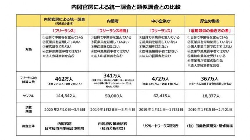 ただ、フリーランスの定義はそもそも定まっていない。例えば一般社団法人プロフェッショナル&パラレルキャリア・フリーランス協会はフリーランスを「特定の企業や団体、組織に専従しない独立した形態で、自身の専門知識やスキルを提供して対価を得る人」と定義しているが、法令上における正確な定義はない。そのため、各種統計調査の取り方も未だ定まっておらず、実は政府統計では(調査は実施されているものの)「フリーランス」の存在を十分に把握できていないのだ。