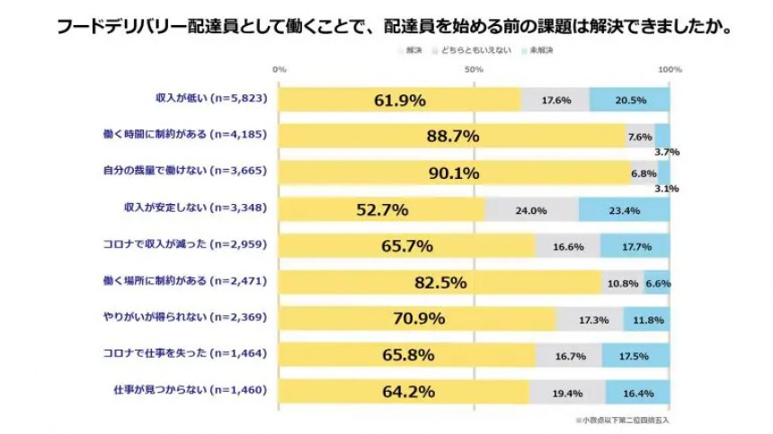 一方で、フードデリバリー配達員としての仕事に満足が得られていない点として、「社会的地位」(17.0%)「多様性に冨んだ人脈形成」(19.0%)が挙げられる。また、ジョブセキュリティの不安定さを上げる声も散見され、同調査には以下のようなコメントが寄せられている。