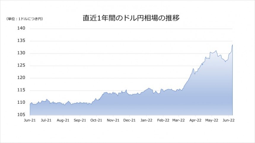 2022年に入り円安の流れが加速しています。過去1年のドル円相場のチャートをみても、今年3月以降、一気に円安が加速し、6月の本稿執筆時点では1ドル=134円台と、20年ぶりの円安水準を付けました。過去1年でみるとドルに対し円は20%以上、価値を下げた計算になります。