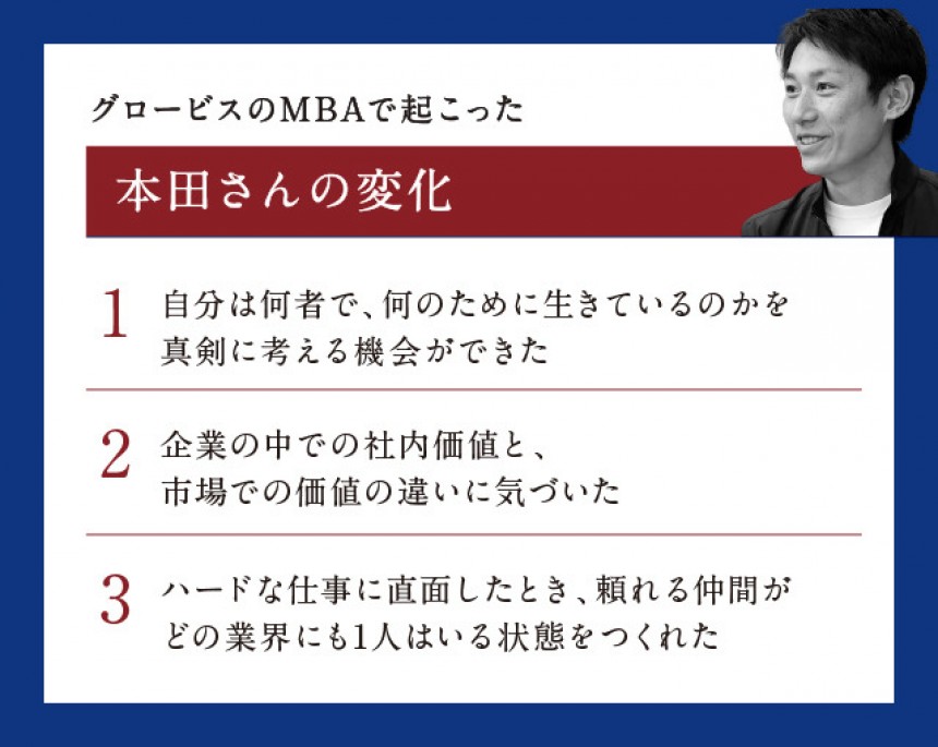 本田:僕もMBAは経営者や一部のエリートのもので、自分には関係ない世界だと思っていたのですが、同期がグロービスに通い始めたことで、急に身近に感じるようになりました。彼は会うたびに成長していて、仕事でも結果を出していました。悔しくなって、自分も追いつきたいと思うようになったんです。