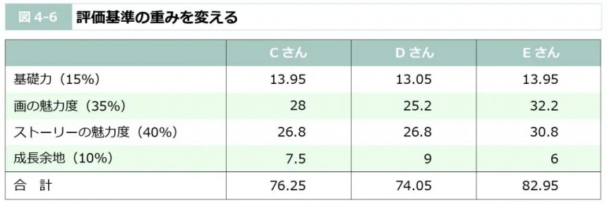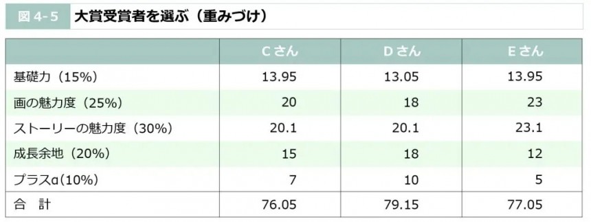 仮に採点結果が同じでも、項目の重みづけによってランキングの結果はまったく異なる結果になりうるというのはビジネスパーソンとしても意識しておきたいポイントです。