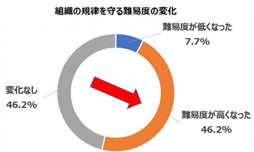 我々の行ったアンケートでも「組織の規律を守る難易度」がどう変化したかという点を調査しました。すると、下記のグラフの通り、難易度が高くなった:46.2%、難易度が低くなった:7.7%、変化なし:46.2% となっています。