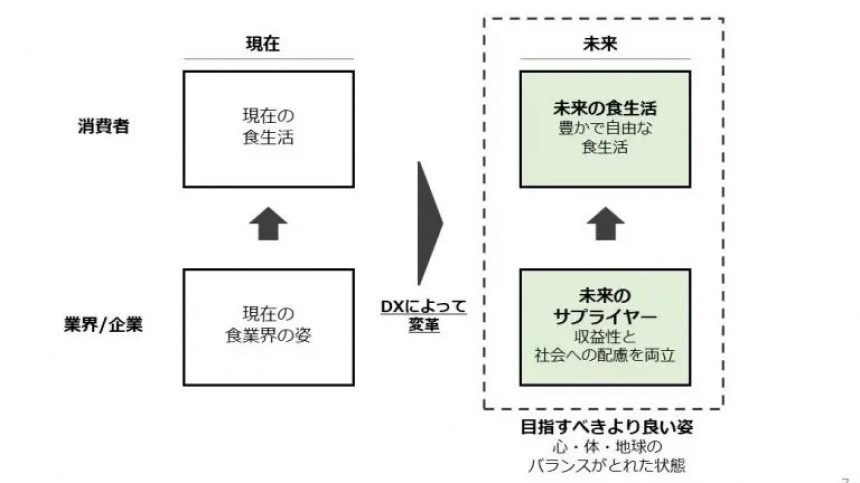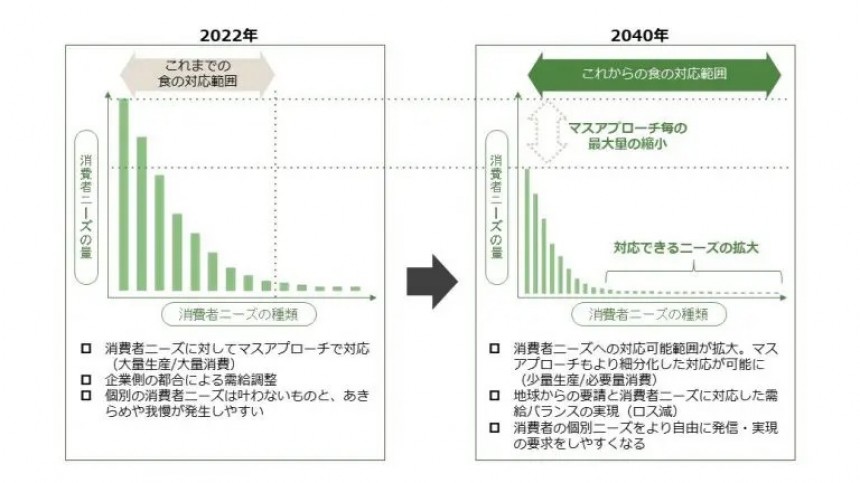 1つ目は、食事は私たちの日常と密接にかかわっているため、胃袋を満たすだけではなく、体の健康を作り、幸せを生み出す効能がある点によるものです。食の変革は消費者の一時の食事「体験」を変えるだけでなく、心身共に活力のある豊かな生活を実現させる可能性があるのです。
