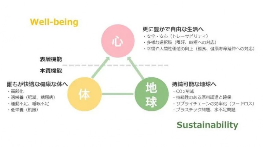 より豊かで自由な食生活が追求されていくにつれ、今後「地球」の健康(サステナビリティ)と「体」の健康を実現することは、あらゆる物事の前提となる、いわば本質的な機能として求められます。その上で、食生活の質を高めるための表層機能として「心」の豊かさの実現が必要です。この3つのバランスを実現できるかどうかは、未来の食のあるべき姿を決める重要なポイントとなります。