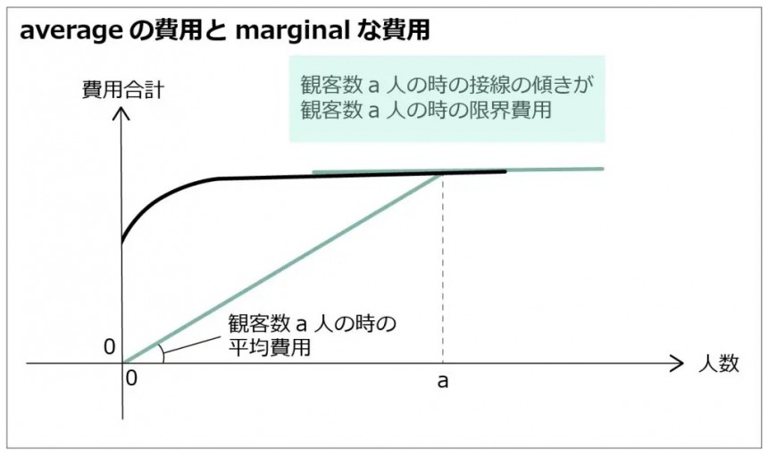さて、観客が1000人、2000人と増えるとどうなるでしょうか。アルバイトなどを増やす必要がありそうですが(現実には事前に見積もります)、追加的に増やす必要のあるコストはきわめて小さくなります。