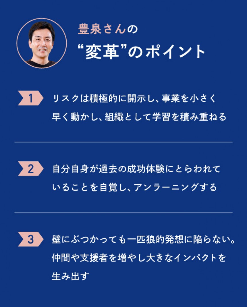 豊泉:そういう反応って、どこにでもあるのでしょうね。市場の競争が厳しくなっていく中で、変革やイノベーションはどの組織でも直面する課題であり、これらに悩む人は自分自身も含めて身近に多くいます。