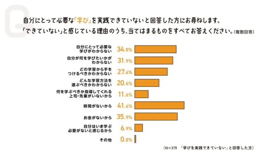 だからこそ、内発的な動機付けが必要です。調査では「必要な学びをできていない理由」として、多くの方が「自分に必要な学び」や「何を学びたいか」がわからないと挙げていますが、前段階として「自分が何をやりたいのか」「今後どのようなキャリアを歩みたいのか」を知ることが大切です。