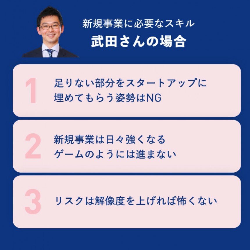 山中:大企業の新規事業ではスタートアップとの連携が不可欠になっています。そのために、どのようなスキルやマインドが必要だと思われますか。