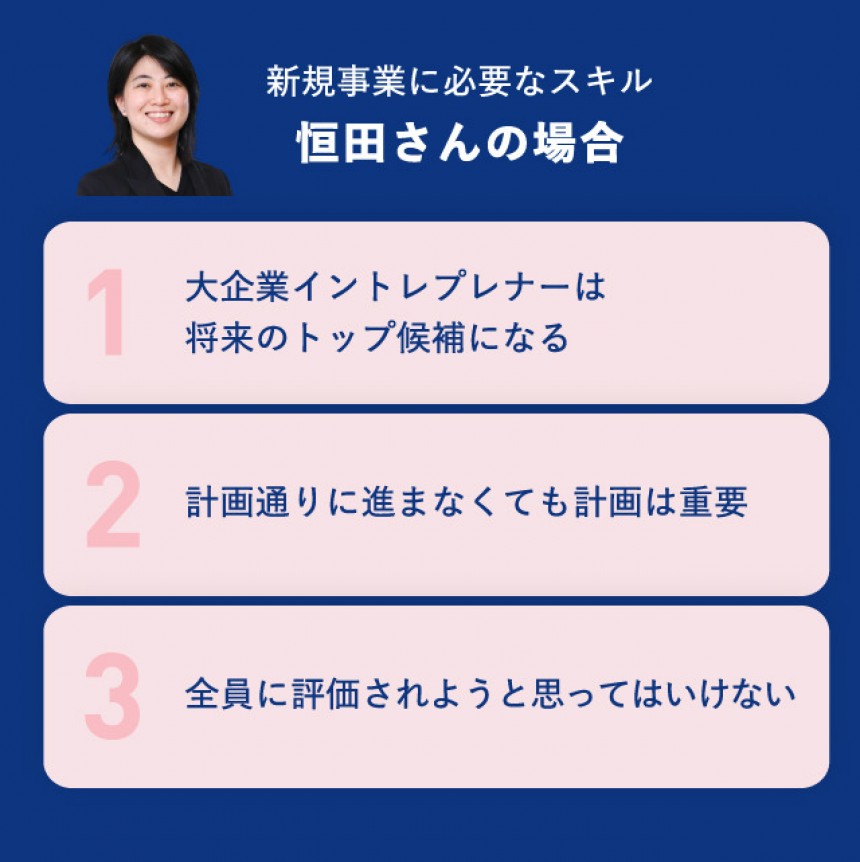 恒田:ひとりで会社を立ち上げるアントレプレナーと、企業内で新規事業を担うイントレプレナーでは求められる資質が異なるんですよね。