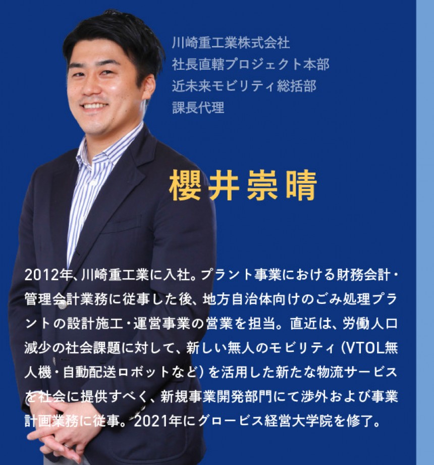 これをきっかけに新規事業に携わることになり、現在はVTOL無人機という無人ヘリコプタを活用した物資輸送サービス事業のプロジェクトリーダーを担っています。