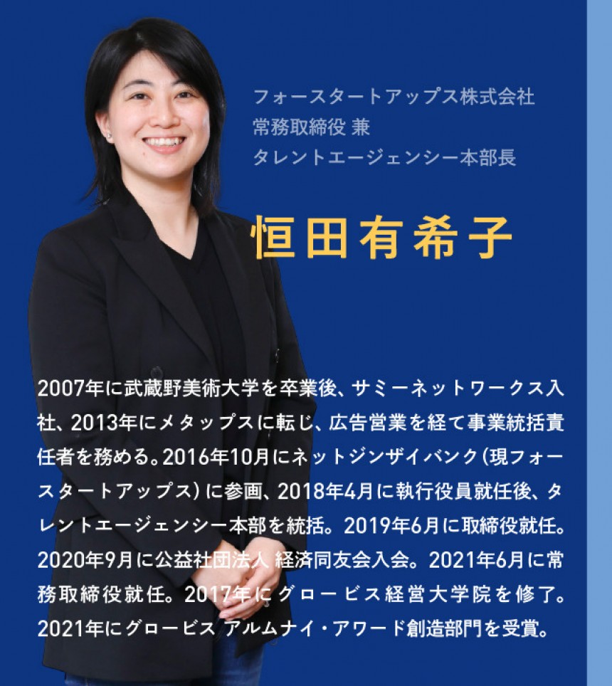 現在は、フォースタートアップスという社名の通り、起業家やスタートアップのための各種支援を提供する企業で人材支援を担っています。