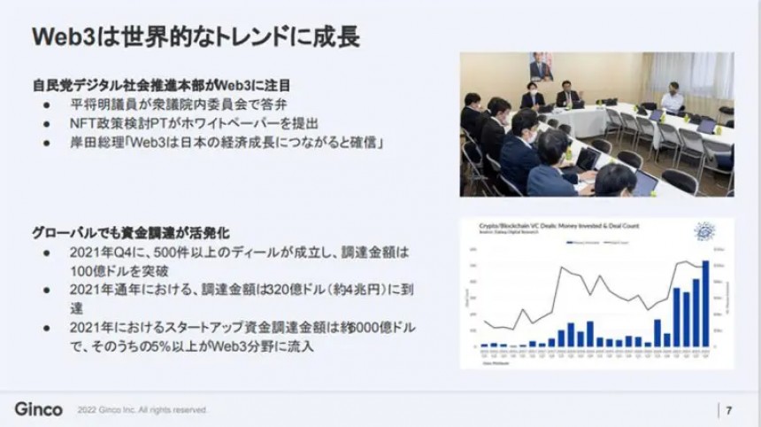 Web3はいま、世界的なトレンドになっています。この領域では数多くのスタートアップベンチャーが台頭し、ユニコーンも誕生するとともに、資金調達も過熱しています。日本でもWeb3を捉えた政策を推進する動きがみられ、大きな一歩だと思っています。