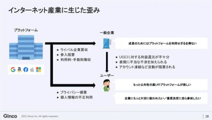 結果として、スタートアップが資金調達をしても、その資金はユーザーグロースのためGoogleやFacebook上の広告活動にどんどん流れてしまう、あるいはアプリケーションによる課金の30%がプラットフォーマーに流れてしまうという例もあり、一般企業は成長すれば成長するほど、多額のマージンを支払わされるような状況になっていきます。