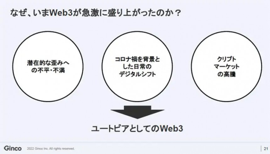 このような歪みへの不平不満に加えて、コロナ禍を背景としたデジタルシフトの進行、そしてデジタルシフトと相性の良いデジタル通貨、クリプトマーケットの高騰にともない、ある種のユートピアとしてWeb3が掲げられていったのではないかと思います。