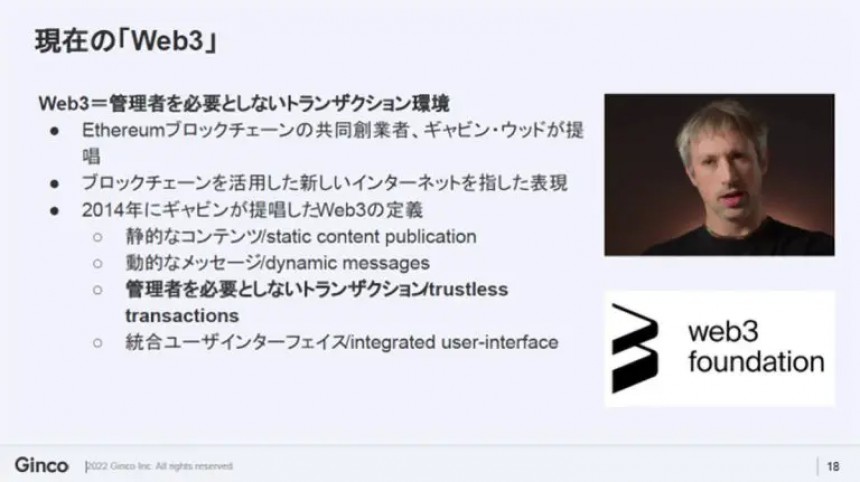 Web3といま現在、言われているものは、Ethereum(ブロックチェーンプロトコルの一種)の共同創業者であるギャビン・ウッド氏が提唱する、管理者を必要としないトランザクション(取引・売買)の実行環境という要素が大きな特徴です。