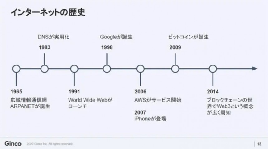 インターネットの歴史を振り返ると、1965年にその前身となる技術が誕生し、1991年にWorld Wide Webがローンチ、色々と端折りますが、その後Googleが誕生します。2014年頃からブロックチェーンという言葉が出始め、2021年から22年にかけて「Web3」という言葉が頻繁に耳に入ってくるようになります。