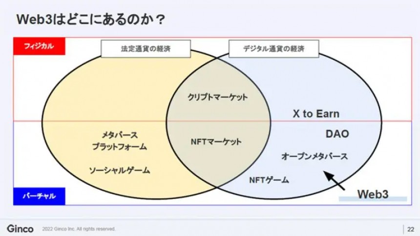 そこにブロックチェーン、クリプト、トークン、NFTなどが合わさっていく、バーチャルかつデジタル通貨による経済こそがWeb3なのではないか思います。たとえば、STEPN「Move to earn」は、「動いて稼ぐ」というコンセプトをもとにした仕組みのゲームで、歩くというフィジカルな行動によってデジタル通貨が得られます。フィジカルな行動にバーチャルが絡み、デジタル通貨によって経済的な要素が加わった