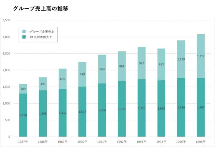 1987年の初年度には約1500億円だったグループ全体の売上高は1996年度に約3000億円まで伸び、JR九州は石井氏が社長を務めた10年の間に大きな進化を遂げました。また、当初JR九州グループ全体の売上高にみるグループ企業(連結子会社合計)の売上高比率は18.2%でしたが、42.6%まで成長しています。この数字からも石井氏が試みた新規事業立ち上げがどれだけ成功したかがわかります。