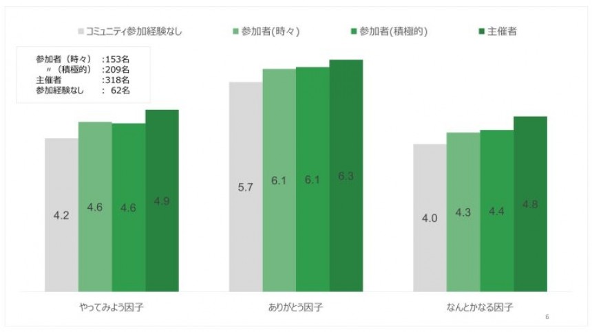 コミュニティ活動で何かにトライする中で、他のメンバーとの助け合いや異なる考え方や属性の人たちとの交流などから、新たな視点を得る。自己理解が深まり、今まで気付かなかった自分自身の強みを発見する。活動に参加してよかったという気持ちから、周囲への感謝が生まれる、こうした姿が浮かびあがってきました。やってみよう因子、ありがとう因子、なんとかなる因子の高まりは、コミュニティにおけるこのような体験を通じ、相互作用的に高まる側面もあると考えられます。