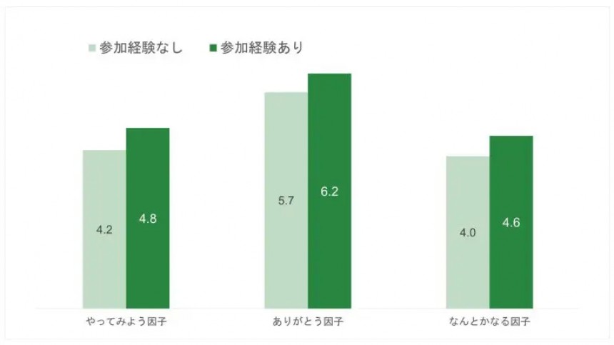 コミュニティ参加経験者と未経験者との4因子の平均点差異を検証したところ、「やってみよう因子」(自己肯定感が強く、主体的に仕事に取り組む)、「ありがとう因子」(周囲に感謝し、利他的に振舞う)、「なんとかなる因子」(楽観的でチャレンジする)の3因子についてはコミュニティ参加経験者の方が高い平均点でした。この結果、コミュニティ参加経験がある方が個人の幸せをより実感していると言えます*。