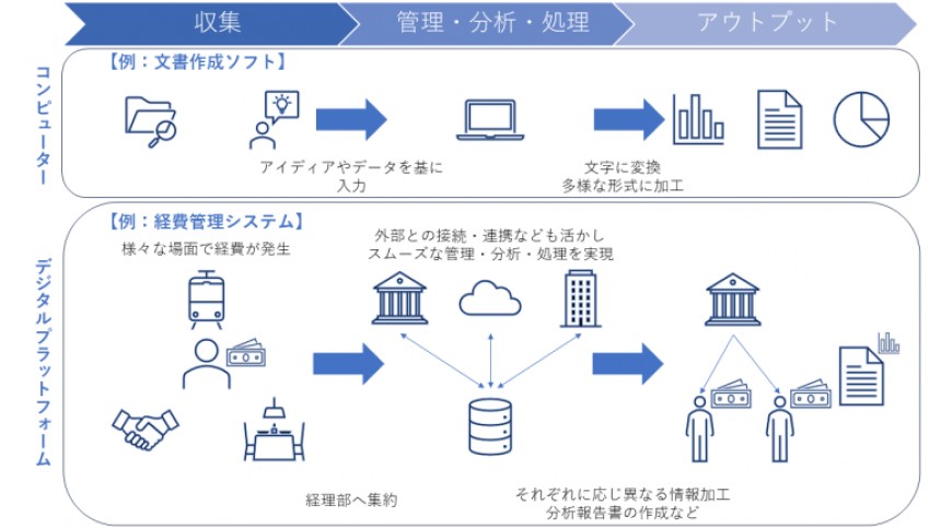 例えば、企業内で行うものであれば、経費管理システムがあります。社員としてみなさんが使った会社経費(電車代や接待交際費など)を入力します。入力された情報は、経理部に集約され、デジタルプラットフォームを通じ情報が処理されます。処理される際、利用者に応じてアウトプットが変化します。例えば、利用した社員に1円単位で支払処理が行われ、明細に反映されます。支払い業務担当者は、金融機関に振込依頼できるように情報を加工します。会社の経営者は、経費に異常な動きが無いか確認していますが、この際は、各人がいくら使ったかという細かい情報よりも、会社全体で合算した上で、分析しやすいように売上高に対する比率や前年同時期の比較を行います。