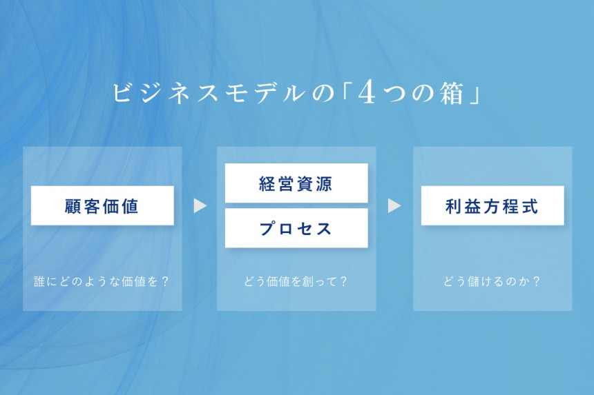 どれだけ革新的なビジネスモデルであろうと、必ず次の4つの箱が必要だと定義しています。それは、「顧客価値」「経営資源」「プロセス」「利益方程式」の4つです。