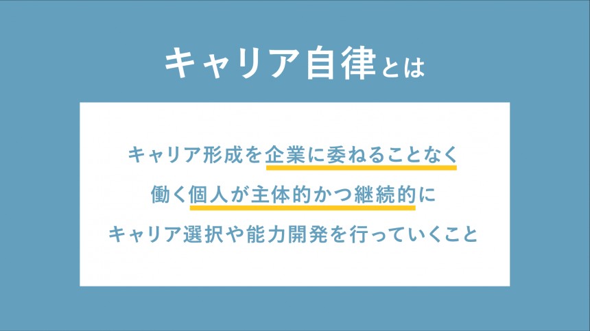 重要なキーワードとなるのは「キャリア自律」という考え方です。キャリア自律とは、「キャリア形成を企業に委ねることなく、働く個人が主体的かつ継続的にキャリア選択や能力開発を行っていくこと」と定義できます。