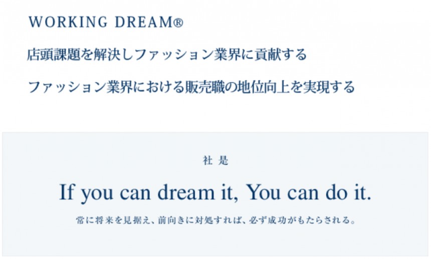 自分たちの仕事は派遣業ではなく採用(転職)支援業であり、店頭からファッション業界を元気にする事業であると再定義した。その時に掲げたのが、「WORKING DREAM®を実現する」という企業理念だ。店頭が活性化するための専門サービスを強化し、派遣しているスタッフがプロフェッショナルになるよう育てて送り出していった。