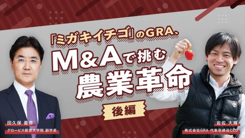 2011年東日本大震災を機に起業した、アグリテックスタートアップの株式会社GRA。1粒1,000円のブランドイチゴ「ミガキイチゴ」を軸に成長してきた同社が発表した、農薬大手の上場企業とのM&A合意のプレスリリースにまつわる話を聞く。聞き手はグロービス経営大学院 副学長の 田久保善彦。(進行=知見録、文=中山景)(全2回、後編)