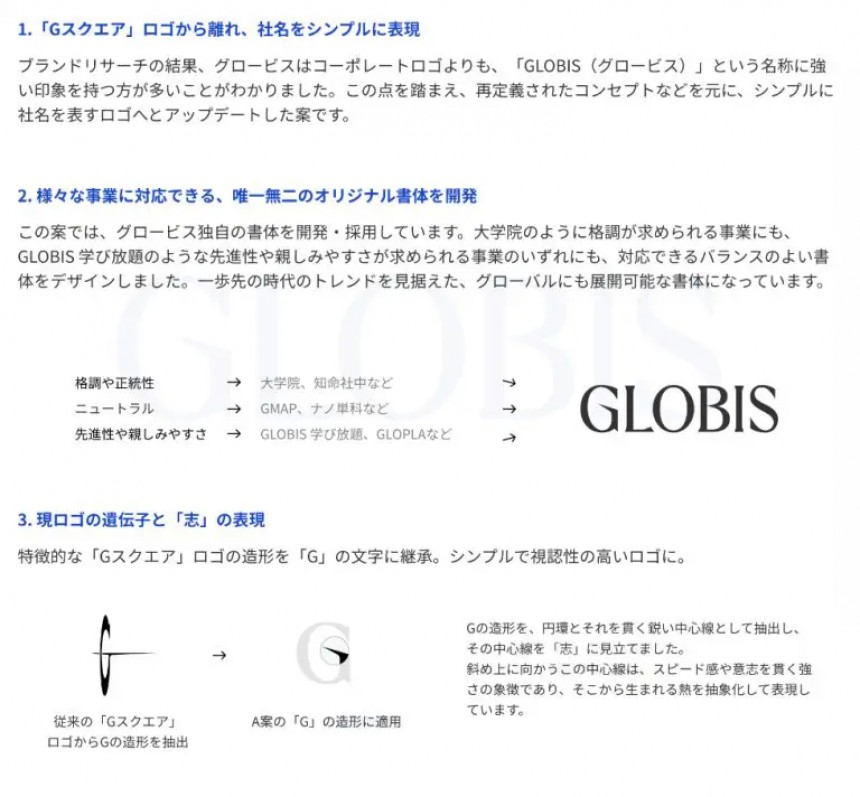 山口:意匠としてはオリジナルの書体で作っていて、書体の一文字一文字にGLOBISらしさを込めています。例えば、スピード感や意志の強さを上向きの角度に込めるなどです。それでいて、ロゴ表現としてはモダンさがあるようにしました。「現ロゴの遺伝子と志の表現」として、投票サイトでも解説した点になります。