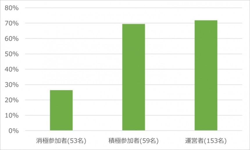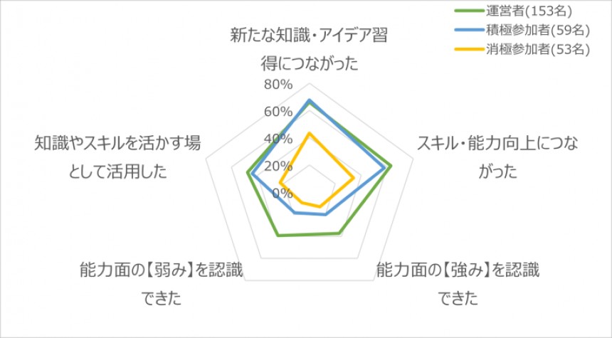 消極参加者に比べて、積極参加者、運営者が知識やスキルを活かす場としてコミュニティを活用したり、新しいことを習得したり、能力向上につなげていることがわかります。また、「能力の強みや弱みの認識」については、運営者の立場だからこそできると考えられます。