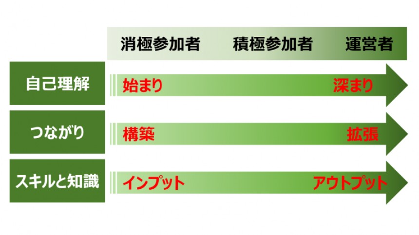 この恩恵の変化を考えると、自分自身の人生を豊かにするためにも、コミュニティへの参加姿勢を積極的に転換し、さらに運営に携わることを目指しても良いのではないでしょうか。今、皆さんが、どの段階の関わりにあるかを確かめてもらい、今より一歩でも二歩でも、コミュニティの中心に入っていただくことを希望します。
