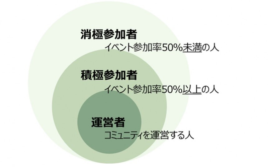 コミュニティに関わると言っても、関わり方のその度合いは人によって様々です。そこで今回の研究では、その関わり方(立場)を「消極参加者」「積極参加者」「運営者」の3つに区分けしました(図1)。