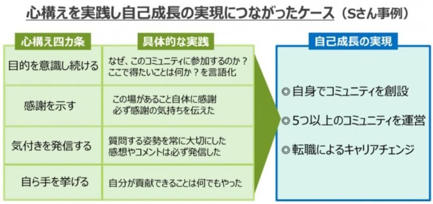それをきっかけにコミュニティ内での声掛けが増え、人的ネットワークも大きく拡がりました。そうしたメリットが次の挑戦への意志を生み、知り合ったメンバーとの新たなコミュニティの創設や、自身の転職への挑戦といった新たな意欲をも生み出したのです。「心構え四カ条」を大事にしたコミュニティへの関わりが、ビジネスパーソンとしてのSさんの人生を、刺激的で豊かなものにするという結果につながったのが分かります。