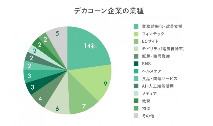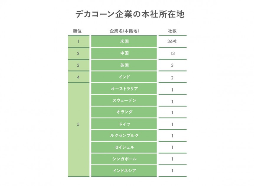 次に多いのはフィンテックと電子商取引(EC)サイトです。これらの企業は、いずれもインターネットやプラットフォームを介してサービスを提供するため、自国以外の市場へのスピーディーな展開が従来の産業より容易であることが、スタートアップのデカコーン化に起因しているのかもしれません。