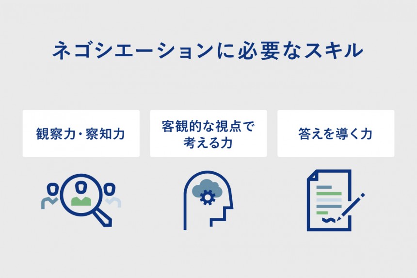 情報収集から始まり、それを分析し、最終的に最善の答えに辿り着く力が必要です。具体的には、答えの候補となる選択肢を列挙する力や、目的に照らして何が優先で何が劣後なのか見極める力、落としどころを決断する力などが含まれます。こうした答えを導く力があると、どんなネゴシエーションも円滑に進行し、相手との良好なリレーションを維持しながら、お互いにとって最適な結論を見つけ出すことが可能になります。しかし、決して短期間で身に付くものではなく、日々の経験と反省を蓄積する中で養うことができるスキルです。