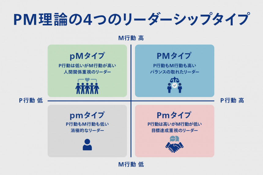 PM理論とは、三隅二不二(みすみじふじ)教授が提唱したリーダーシップの行動理論です。この理論では、リーダーシップ行動を「P行動(Performance:目標達成行動)」と「M行動(Maintenance:集団維持行動)」の2つの軸で分析します。
