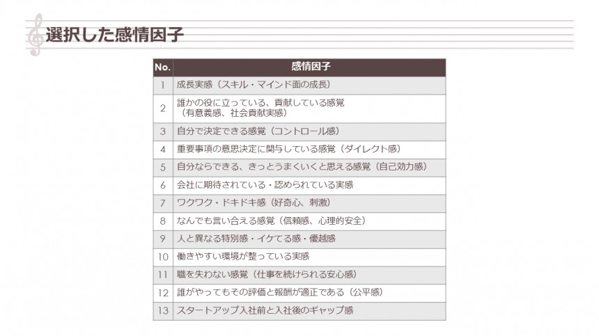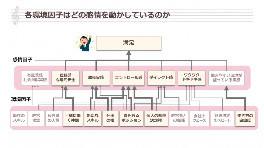 先ほどあげた満足につながる4つの感情因子(成長実感、コントロール感、ダイレクト感、ワクワク・ドキドキ感)が、スタートアップ特有の複数の環境因子により、動かされている構図を描くことができました。また、信頼感や心理的安全性へも太い矢印が出ています。実際にインタビューでは、一緒に働く仲間との気軽なコミュニケーションが取れることによる心理的安全性の確保に言及する声を多く聞くことができました。