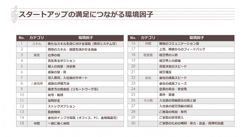 - スタートアップでは、仕事の幅や個人の裁量、経営者との距離など6つの環境因子が満足度に寄与している。一方で、導入教育の少なさや企業の寿命に不安を持つ人や、ステージの変化による企業風土の変化で不満を感じる例もあった。