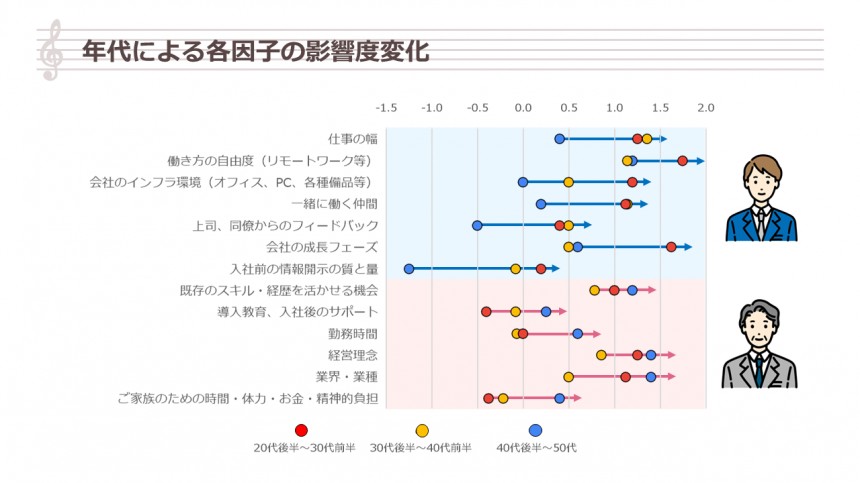 一方、50代に近づく高い年代では、経営理念や業界・業種、既存のスキル活用という因子から、良い影響を受けている傾向が見られました。